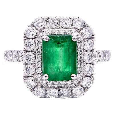 Crafted in platinum, the setting provides superior strength and a naturally bright finish that enhances both the crisp sparkle of the diamonds and the vivid intensity of the emerald. The structured double halo amplifies finger coverage while maintaining elegant balance, resulting in a bold yet timeless silhouette suited to discerning tastes.