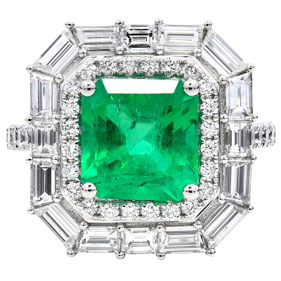 The diamonds total 1.67ct, graded SI in clarity and G-H in colour, chosen for their lively fire and perfect harmony with the emerald’s intensity. The combination of baguette and brilliant cuts gives the ring both structure and radiance, creating a luxurious contrast of geometry and light. The platinum setting ensures durability and purity, its cool lustre providing the ideal backdrop for the gemstones to shine in unison. Every detail of this piece reflects meticulous craftsmanship and enduring luxury.