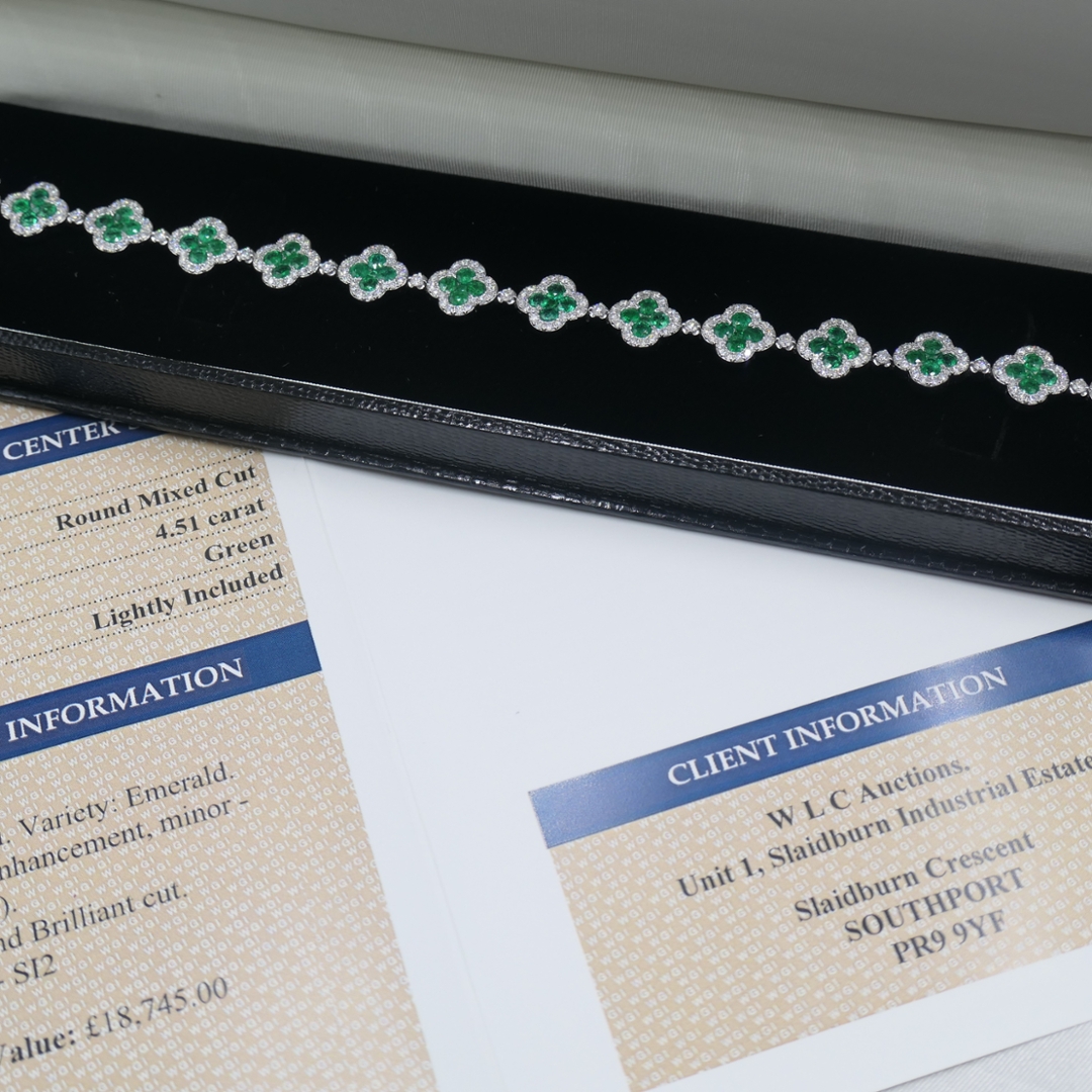 Weighing an impressive 19.02 grams, the bracelet feels substantial yet graceful on the wrist, reflecting both luxury and comfort in equal measure. The 18ct white gold setting provides a cool, luminous backdrop that accentuates the vivid depth of the emeralds and the pure sparkle of the diamonds, embodying a look of distinguished sophistication.