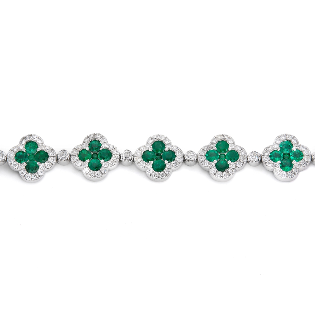 A brand-new, unused certified natural diamond and emerald gemstone cluster bracelet that radiates timeless luxury and exquisite craftsmanship. Expertly crafted in 18ct white gold, this stunning bracelet showcases a mesmerising combination of 4.51 carats of round mixed-cut emeralds and 2.57 carats of brilliant-cut natural diamonds. The vivid green hue of the emeralds brings a captivating burst of colour, while the dazzling brilliance of the diamonds, graded F–G in colour and SI1–SI2 in clarity, creates an enchanting contrast that shimmers with every movement. Each stone has been perfectly set to enhance its natural beauty, forming a breathtaking display of elegance and refinement.