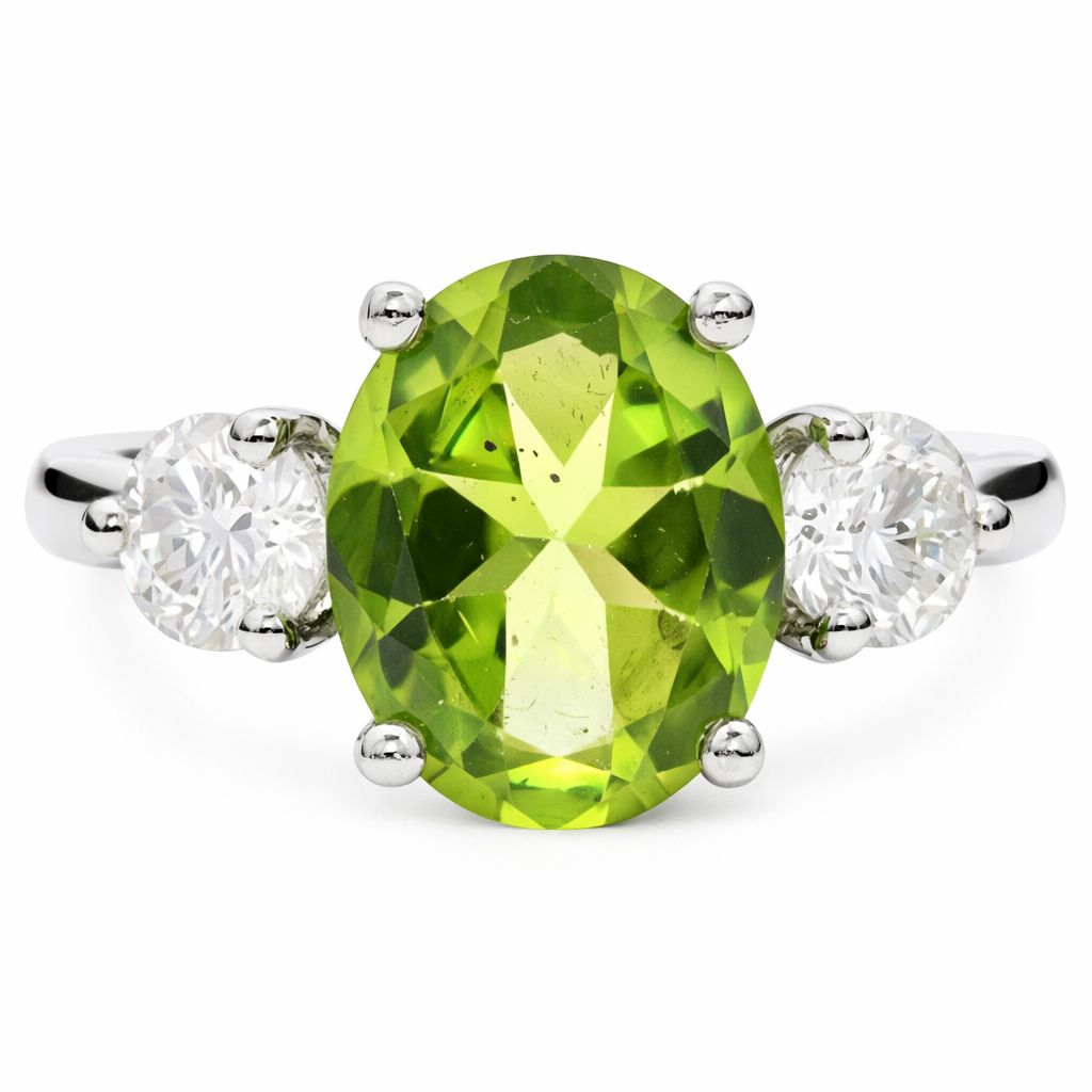 A brand-new, unused, certified platinum ring featuring a striking 2.61ct oval-cut green peridot gemstone, radiating a vivid, refreshing hue that instantly draws the eye. The captivating centre stone is elegantly complemented by two natural brilliant-cut diamonds on either side, totalling 0.60ct, adding a refined brilliance that enhances the peridot’s vibrant tones. Each diamond, graded G-H in colour with SI clarity, brings a captivating sparkle that pairs beautifully with the rich green gemstone, all securely set within a premium platinum mount for lasting durability and elegance.