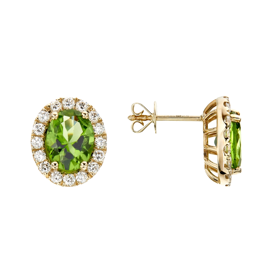 A brand-new, unused, certified natural pair of diamond & green peridot oval-shaped cluster earrings, set with two oval mixed-cut green peridot gemstones at the centre & a cluster of brilliant-cut diamonds in a halo setting, set in 9ct yellow gold.