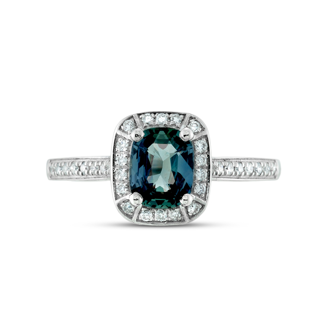- > Natural Green Sapphire 1.02ct & Diamond 0.18ct Cushion Shaped Cluster Ring