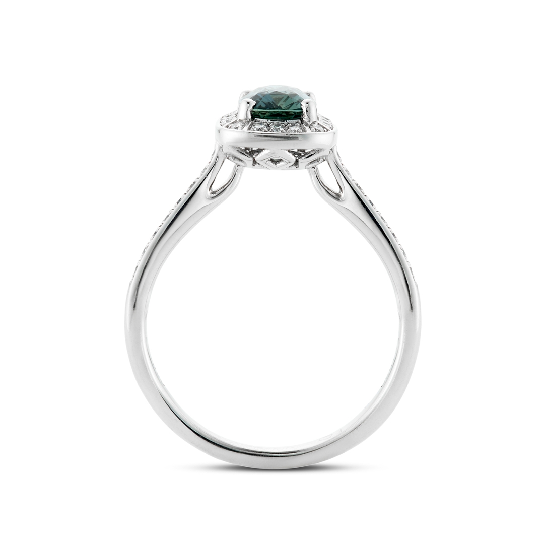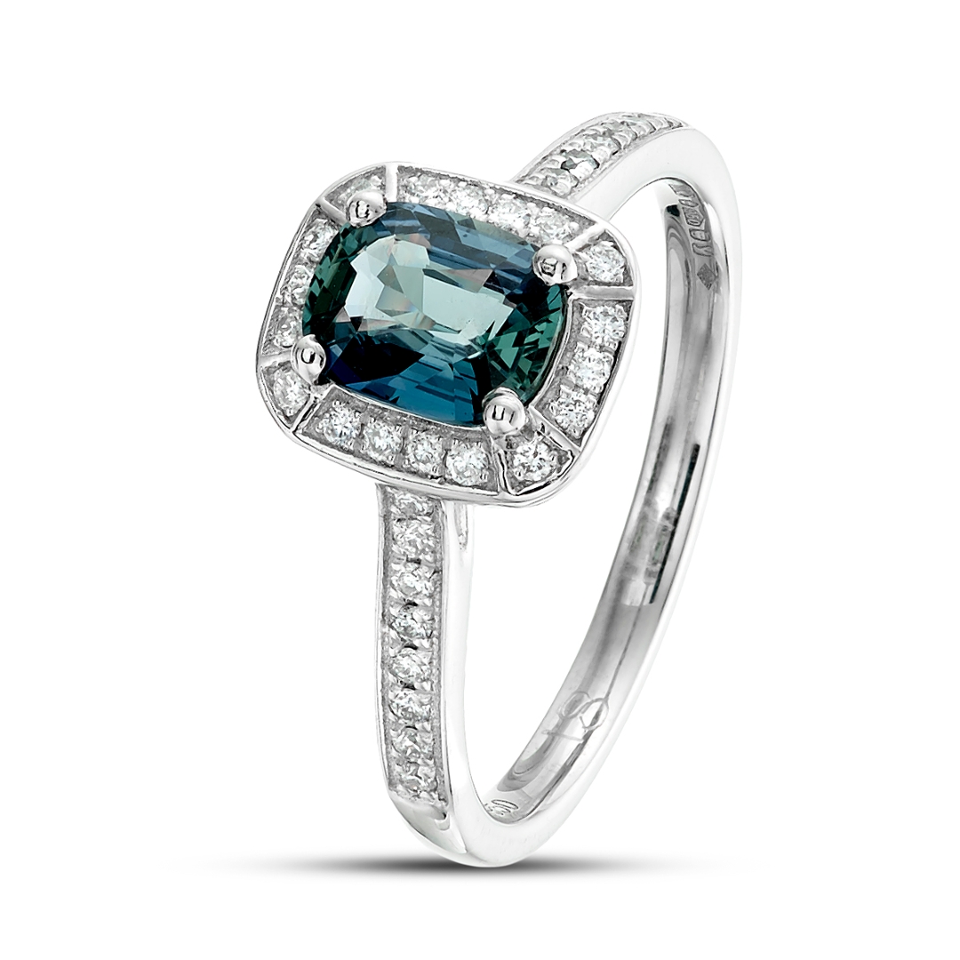 A brand-new, unused certified natural diamond and green sapphire cluster ring that embodies timeless sophistication and refined craftsmanship. At its centre lies a 1.02-carat cushion-cut green sapphire, displaying a beautiful bluish-green hue that shifts elegantly with different lighting. Surrounding the gemstone is a delicate halo of brilliant-cut natural diamonds, extending along the shoulders to create a graceful sparkle that enhances the sapphire’s rich tone. With a total diamond weight of 0.18 carats, graded G–H in colour and SI1–SI2 in clarity, the diamonds add a touch of brilliance and contrast that elevates the ring’s overall allure.