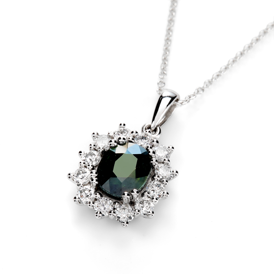 - > Natural Green Sapphire 1.47ct & Diamond 0.59ct Cluster Pendant