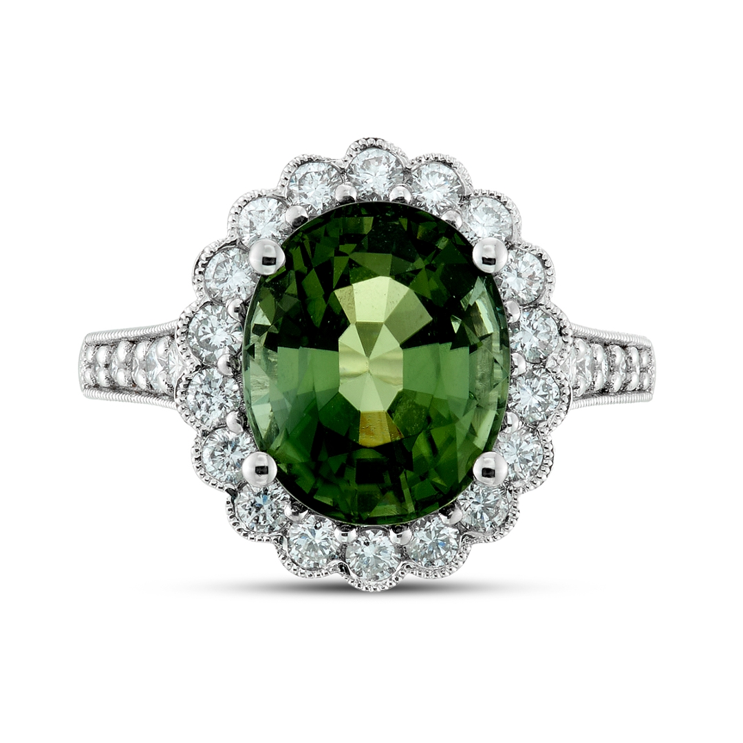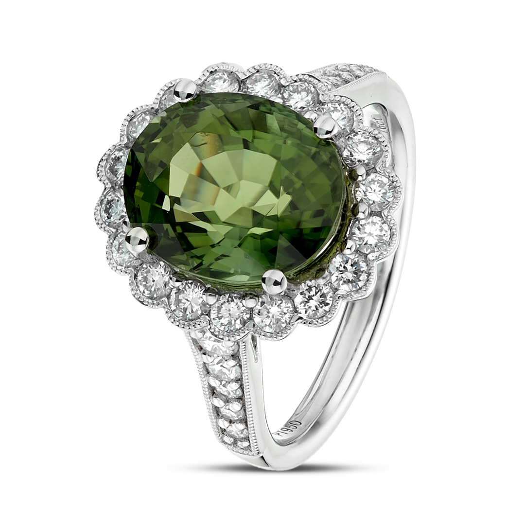 A brand-new, unused, certified natural diamond & green tourmaline flower-shaped cluster ring, with one oval mixed-cut green tourmaline gemstone to the centre & a cluster of brilliant-cut diamonds in a halo setting & to the shoulders, set in platinum.