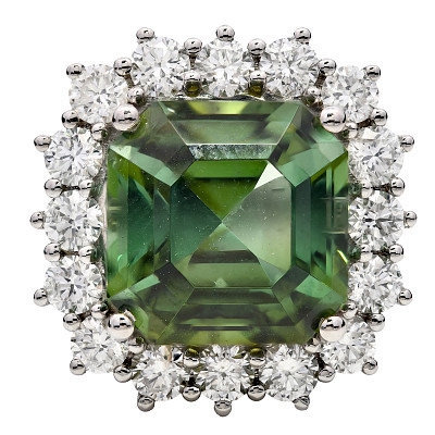 - > Natural Green Tourmaline 8.44ct & Diamond 1.38ct Cluster Ring