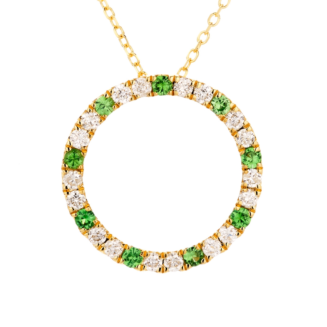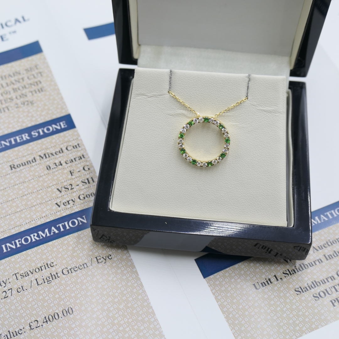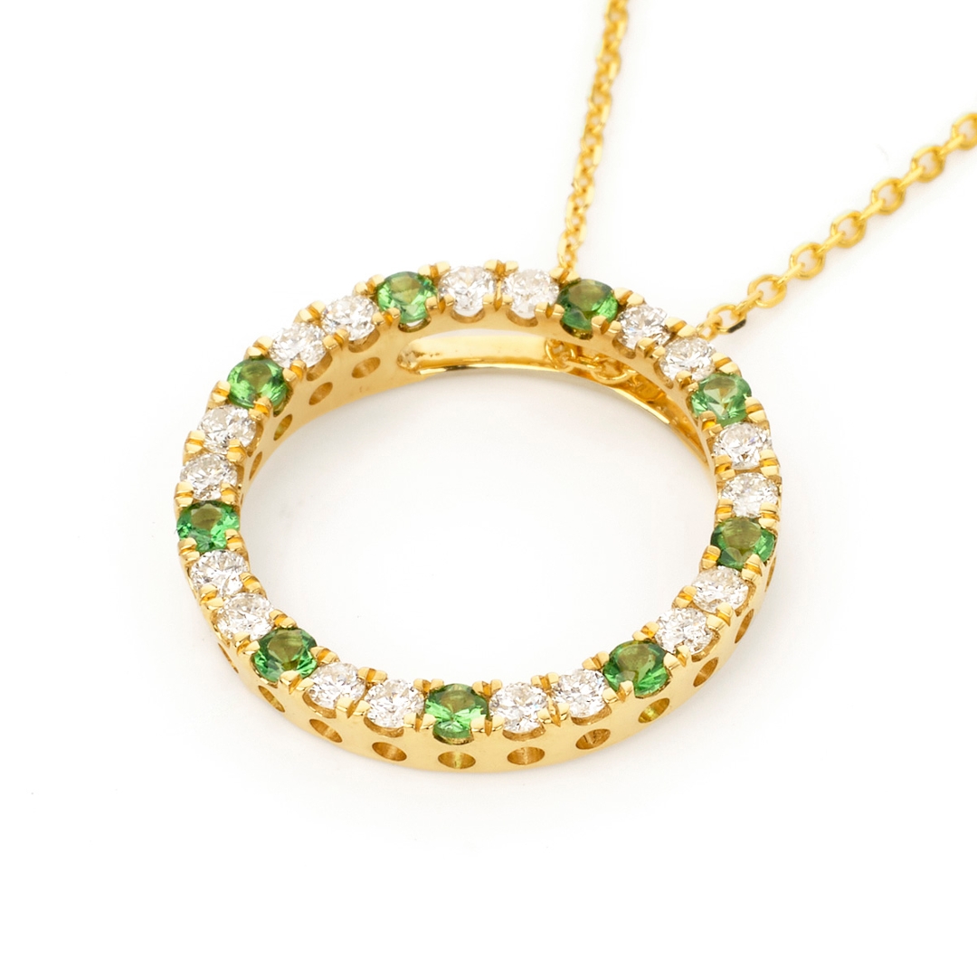 A brand new, unused, certified 18ct yellow gold natural diamond & green tsavorite circle-shaped pendant, set with a cluster of round mixed cut green tsavorite gemstones & a cluster of brilliant cut diamonds in a circle-shaped design.