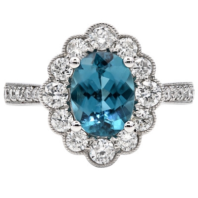 A brand-new, unused, certified natural diamond & indigo blue tourmaline flower-shaped cluster ring, with one oval-cut indigo blue tourmaline gemstone at the centre & a cluster of brilliant-cut diamonds in a halo setting & to the shoulders, set in platinum.
