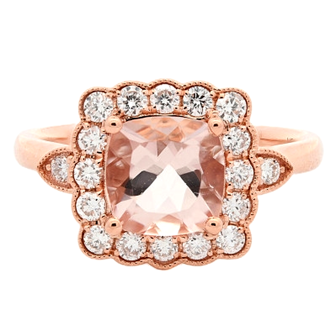 A brand-new, unused certified 18ct rose gold ring featuring a radiant 1.20ct cushion-cut morganite gemstone at its centre, admired for its delicate blush-pink hue and exceptional clarity. The centre stone is framed in an elegant flower-shaped cluster, accented by two natural brilliant-cut diamonds on the sides and additional smaller diamonds, totalling 0.38ct. The warm tone of the rose gold beautifully enhances the soft colour of the morganite, while the diamonds add brilliance and contrast, creating a ring that perfectly balances romance and refinement.