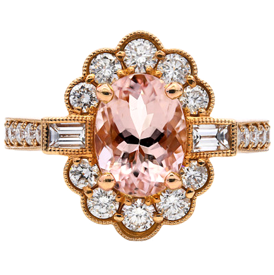 A brand-new, unused, certified natural diamond & morganite flower-shaped cluster ring, with one oval-cut morganite gemstone at the centre, two baguette-cut diamonds to the sides & a cluster of brilliant-cut diamonds in a halo setting & on the shoulders, set in 18ct rose gold.