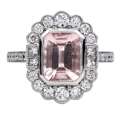 A brand-new, unused, certified natural diamond & morganite flower-shaped cluster ring, with one emerald-cut morganite gemstone at the centre, four princess-cut diamonds to the sides & a cluster of brilliant-cut diamonds in a halo setting & to the shoulders, set in platinum.