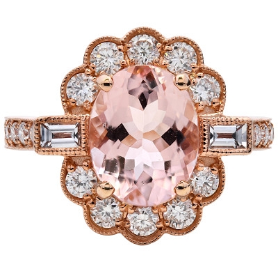 A brand-new, unused, certified 18ct rose gold diamond & morganite gemstone flower-shaped cluster ring, set with one oval-cut morganite gemstone at the centre & a cluster of baguette-cut & brilliant-cut diamonds in a halo setting & to the shoulders.