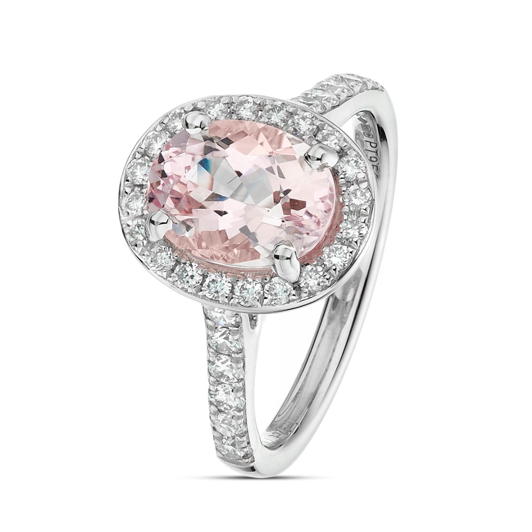 A brand-new, unused, certified natural diamond & morganite oval-shaped cluster ring, with one oval mixed-cut morganite gemstone to the centre & a cluster of brilliant-cut diamonds in a halo setting & to the shoulders, set in platinum.