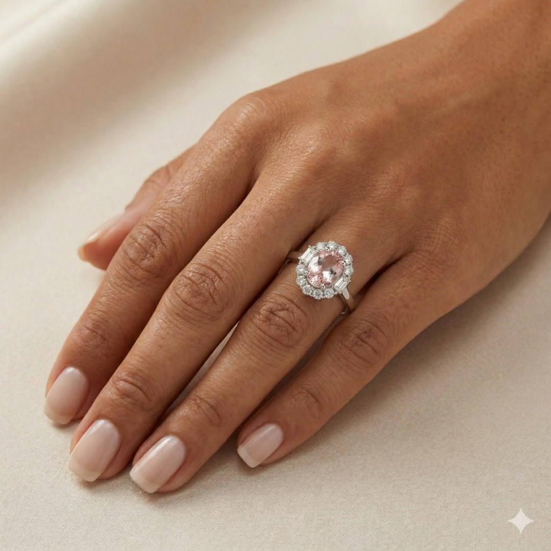 Framing the centre stone are two baguette-cut natural diamonds positioned on either side, accompanied by a halo of ten brilliant-cut diamonds that complete the cluster design. These diamonds have a combined weight of 0.70ct and introduce impressive sparkle, creating a bright contrast against the gentle hue of the morganite. Natural diamonds are consistently celebrated for their rarity, remarkable strength and enduring desirability, qualities that have secured their position as the most recognised gemstone in fine jewellery.
