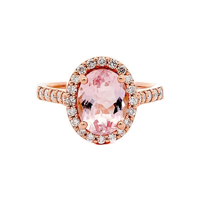 A brand-new, unused, certified natural diamond & morganite gemstone oval-shaped cluster ring, set with one oval-cut morganite gemstone at the centre & a cluster of brilliant-cut diamonds in a halo setting & to the shoulders, set in 18ct rose gold.