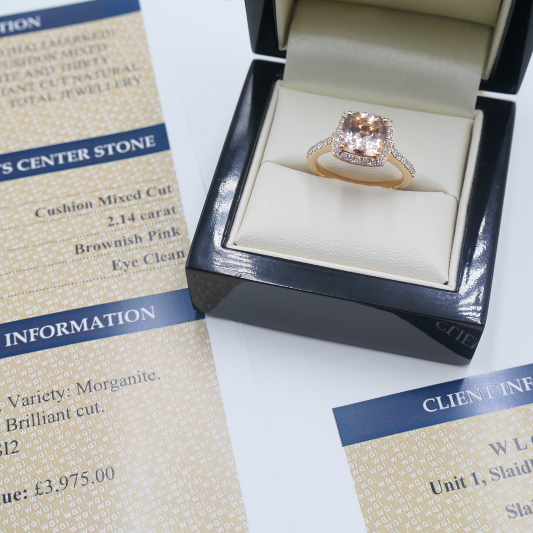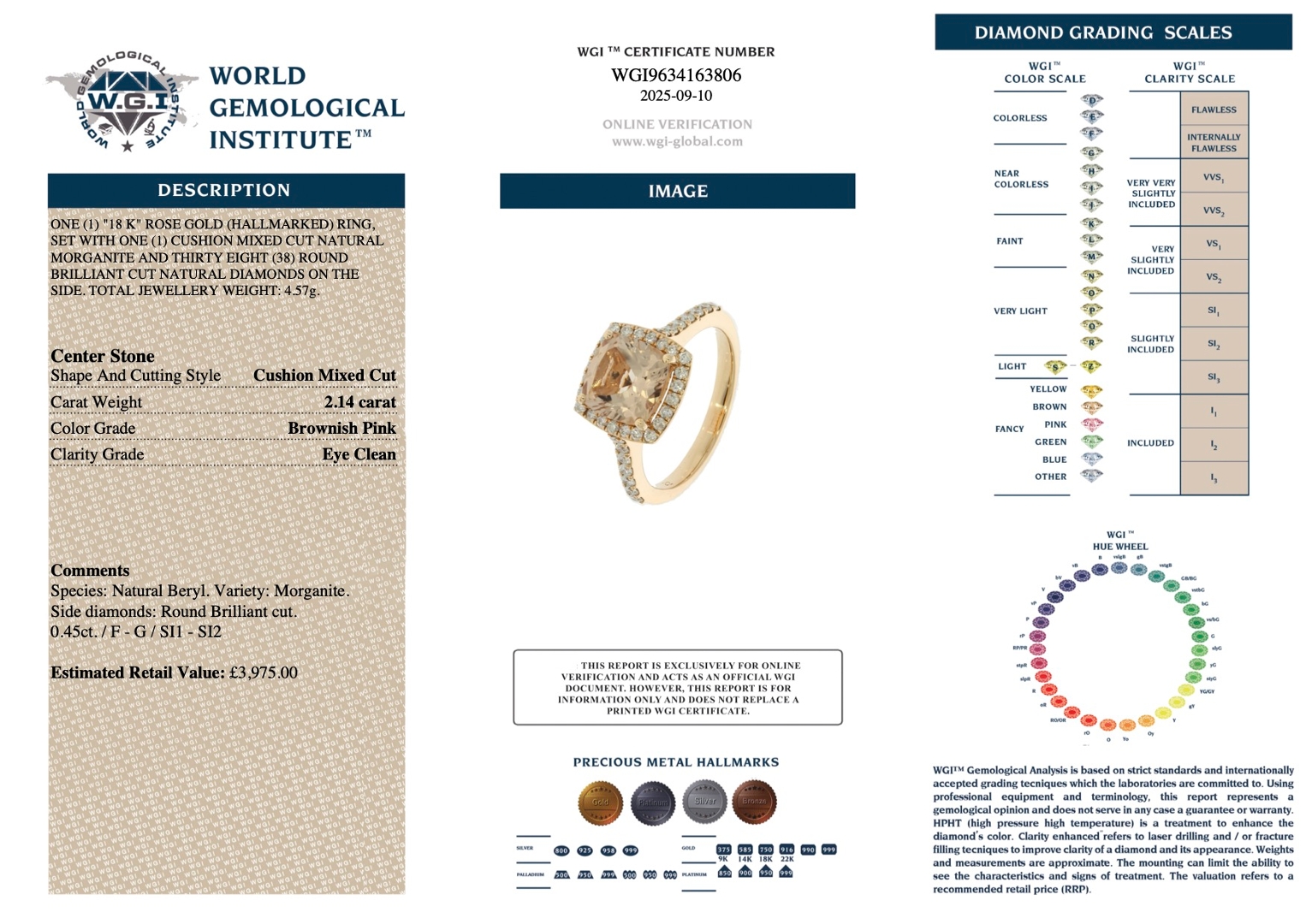 A brand-new, unused certified natural diamond and morganite cluster ring that exudes warmth, romance and refined elegance. At its centre lies a captivating 2.14ct cushion mixed-cut morganite gemstone, displaying a soft brownish-pink hue that glows beautifully in every light. Surrounding the centre stone is a halo of brilliant-cut natural diamonds, with additional diamonds cascading along the shoulders for extra radiance. The diamonds, totalling 0.45ct, are graded F–G in colour and SI1–SI2 in clarity, adding a bright and luxurious contrast to the delicate tones of the morganite. Expertly set in 18ct rose gold, the warm blush of the metal enhances the gemstone’s romantic colouring, creating a piece that feels both feminine and timeless. With a total weight of 4.57 grams and a professional valuation of £3,975, this ring epitomises fine craftsmanship and lasting beauty.