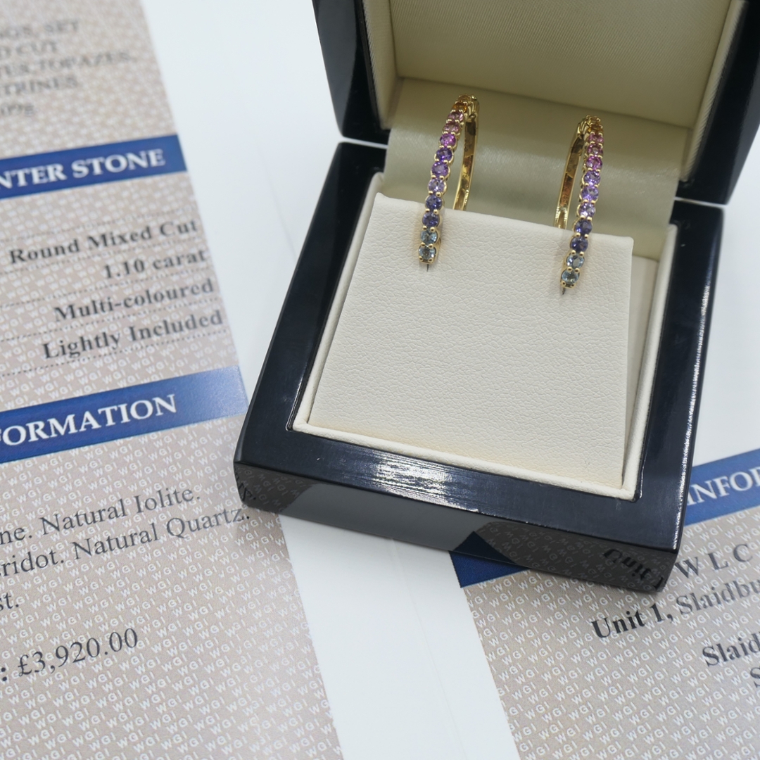 A brand new, unused certified pair of natural multi-coloured precious gemstone hooped earrings, set with a cluster of round mixed cut multi-coloured tourmalines, iolites, topazes, peridots, amethysts & citrines gemstones, set in 18ct yellow gold.