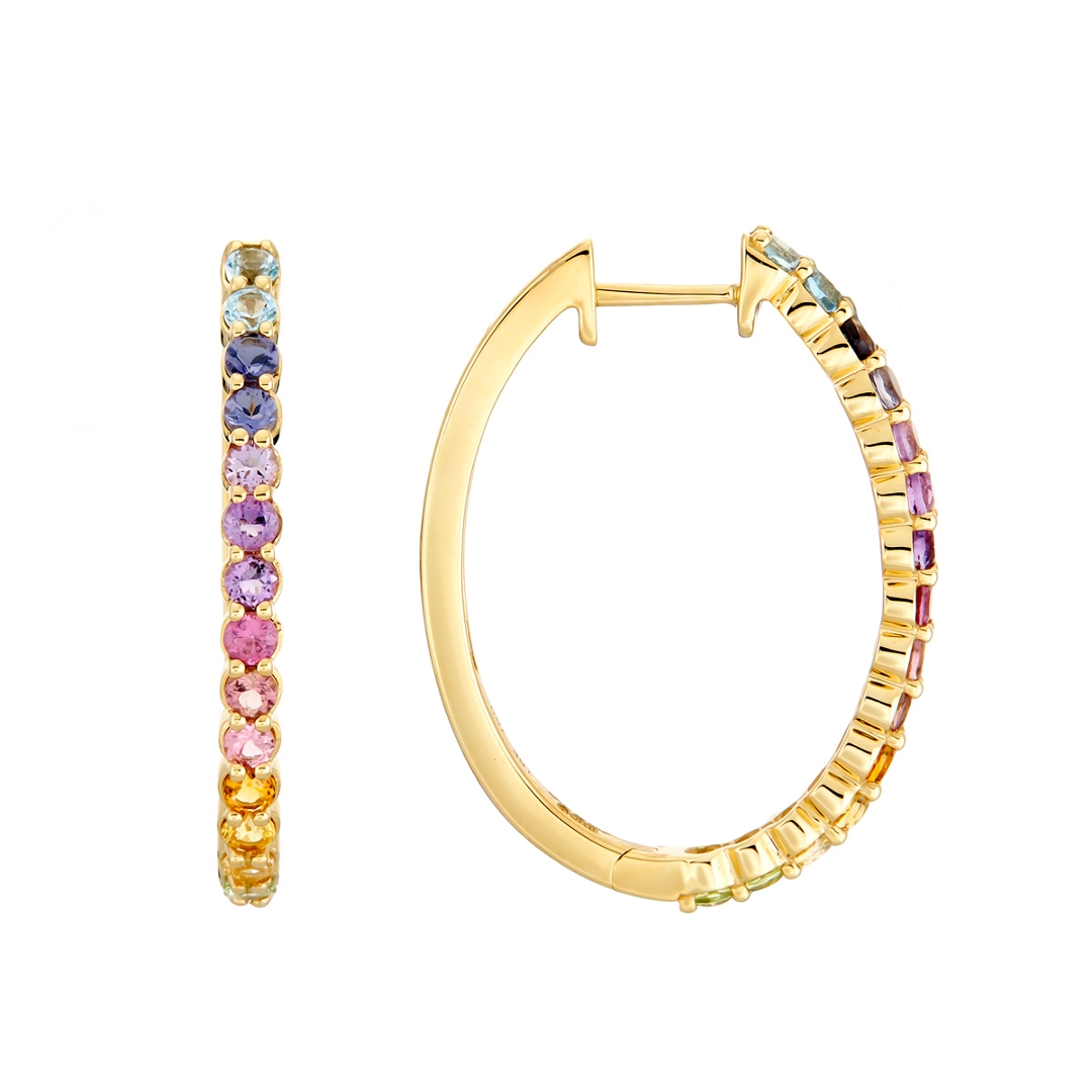 A brand-new, unused certified pair of 18ct yellow gold hooped earrings, expertly crafted to display a vibrant array of natural multi-coloured precious gemstones. Set with a total of 1.10ct of round, mixed-cut tourmalines, iolites, topazes, peridots, amethysts, and citrines, each gemstone has been carefully selected for its vivid hue, fine clarity, and radiant sparkle. The harmonious mix of rich purples, golden yellows, fresh greens, cool blues and delicate pinks creates a captivating spectrum of colour that flows beautifully along the hoops. The warm glow of the yellow gold setting enhances the depth and richness of each gemstone, adding a touch of timeless luxury to the design. Weighing 5.09 grams.