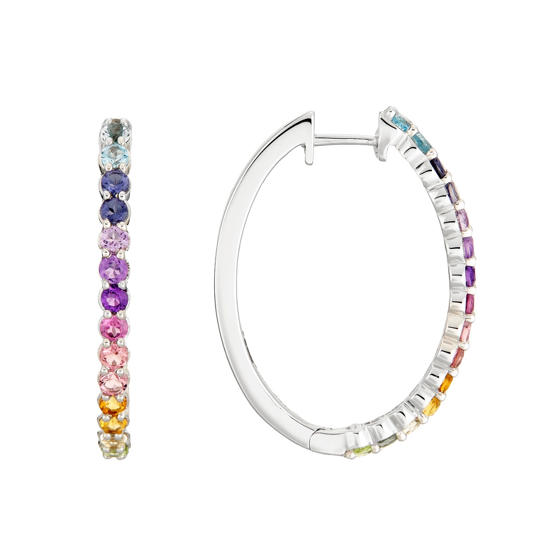 A brand-new, unused certified pair of 18ct white gold hooped earrings, designed to showcase a stunning medley of natural precious gemstones. Set with a total of 1.14ct of round, mixed-cut tourmalines, iolites, peridots, amethysts, and citrines, each stone has been carefully selected for its vibrant hue, clarity, and lively brilliance. The harmonious blend of rich purples, fresh greens, golden yellows, soft blues and pinks creates a captivating spectrum of colour that is both elegant and eye-catching. The cool lustre of the white gold setting enhances the brightness of each gemstone, allowing their natural beauty to shine through with exceptional clarity.