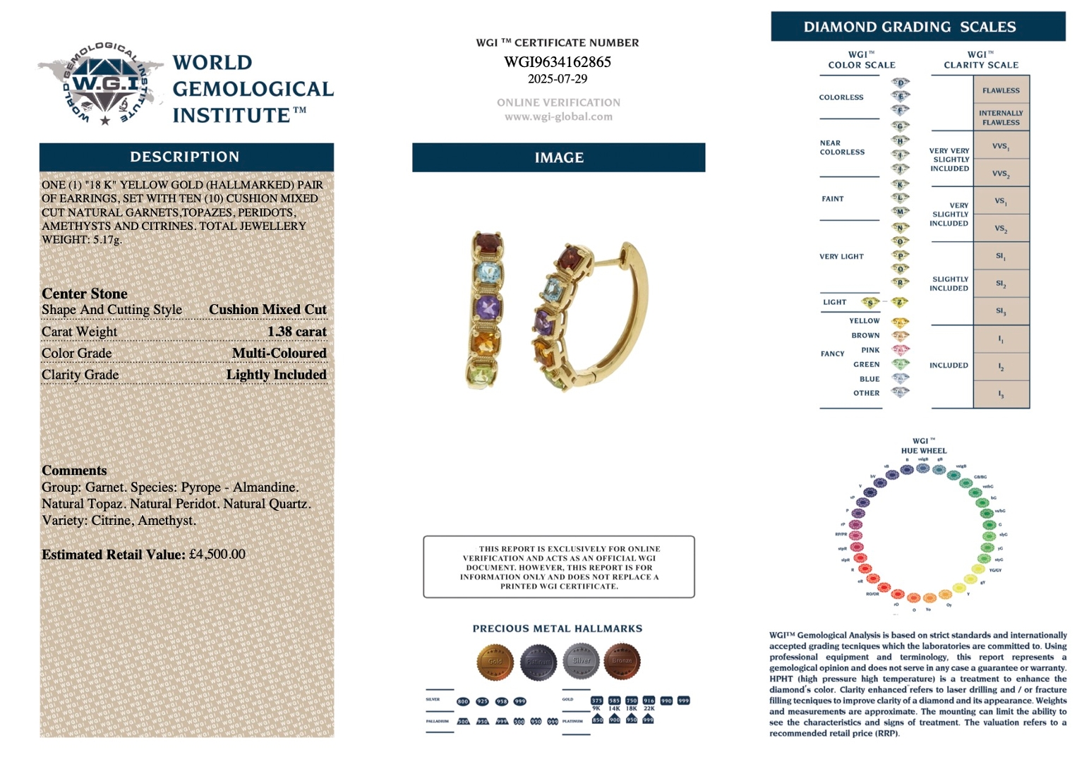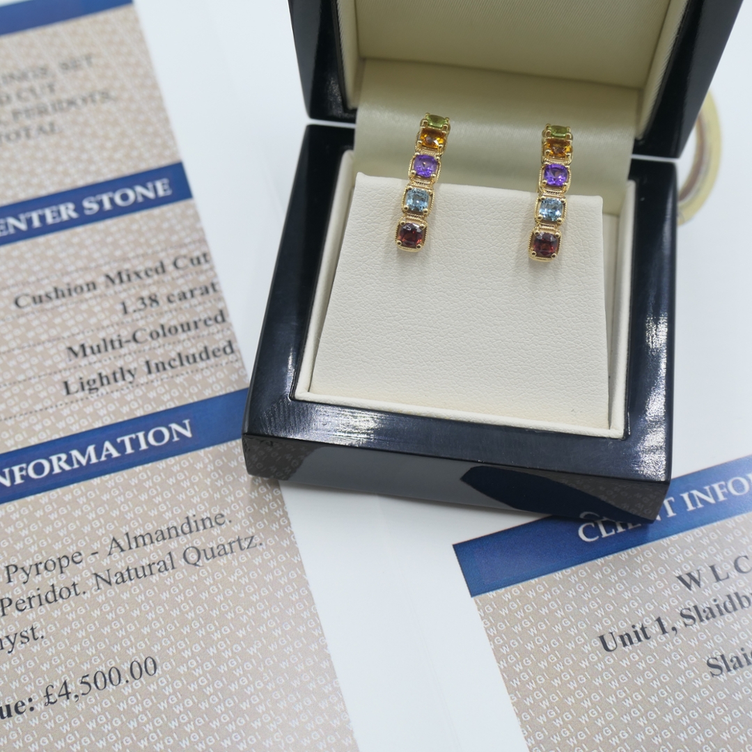 Natural gemstones are admired for their individuality and enduring charm, with no two stones ever exactly alike. This multi-gemstone composition offers both elegance and versatility, making it suitable for a wide range of occasions, from everyday wear to special events. The fine craftsmanship ensures the earrings will remain a treasured part of any jewellery collection for years to come. Weighing 5.17 grams. Supplied with certification and a professional valuation of £4,500.00, they represent a luxurious fusion of vibrant colour, timeless style, and expert artistry, making them an exceptional choice for lovers of distinctive, high-quality gemstone jewellery.