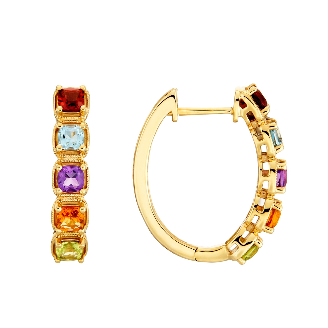 A brand-new, unused certified pair of 18ct yellow gold hooped earrings, exquisitely crafted to display the rich beauty of natural multi-coloured precious gemstones. Set with a total of 1.38ct of cushion mixed-cut garnets, topazes, peridots, amethysts, and citrines, each gemstone has been carefully selected for its vibrant hue, clarity, and brilliance. The combination of deep reds, sunny yellows, lush greens, regal purples and serene blues creates a captivating spectrum of colour, perfectly complemented by the warm glow of the yellow gold setting. The cushion-cut gemstones add depth and texture to the design, ensuring each stone reflects light beautifully from every angle.