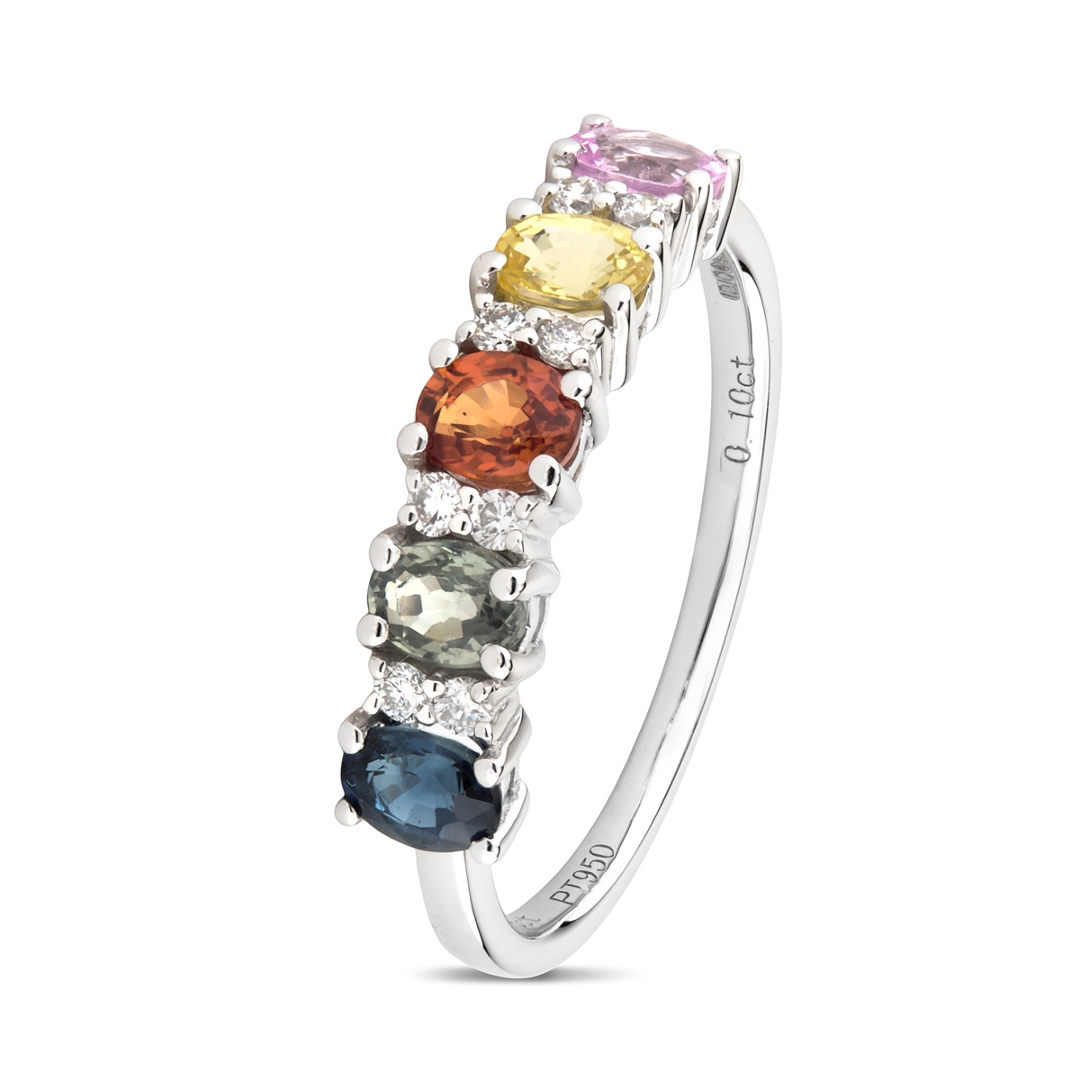 A brand-new, unused certified platinum eternity ring, designed to showcase the vibrant beauty of sapphires alongside the timeless sparkle of natural diamonds. Set with 1.18ct of round, mixed-cut, multi-coloured sapphires, each gemstone has been carefully chosen for its vivid hue, fine clarity, and captivating brilliance, forming a continuous ribbon of colour around the band. Complementing the sapphires are 0.10ct of mixed-cut natural diamonds, graded F-G in colour and VS2-SI1 in clarity, whose bright, crisp radiance stands out perfectly against the incredible, enduring lustre of the platinum, which weighs 2.83 grams. The design achieves a refined balance of elegance, vibrancy and strength.