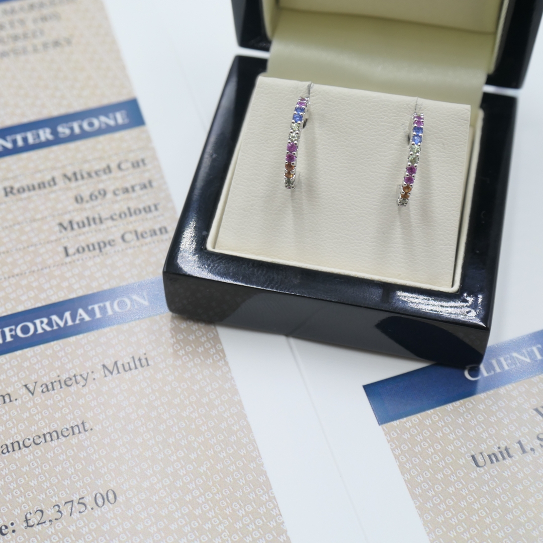 A brand-new, unused, certified pair of 18ct white gold, natural multi-coloured sapphire, hooped earrings. These radiant pieces are a celebration of colour, elegance, and playful sophistication. Each earring is set with a beautifully arranged cluster of round mixed-cut sapphires, totalling 0.69ct, in a vibrant array of hues including soft pinks, vivid blues, golden yellows, and lush purples. The lively mix of colours brings a joyful, contemporary flair to a classic design, symbolising creativity, individuality, and timeless beauty.