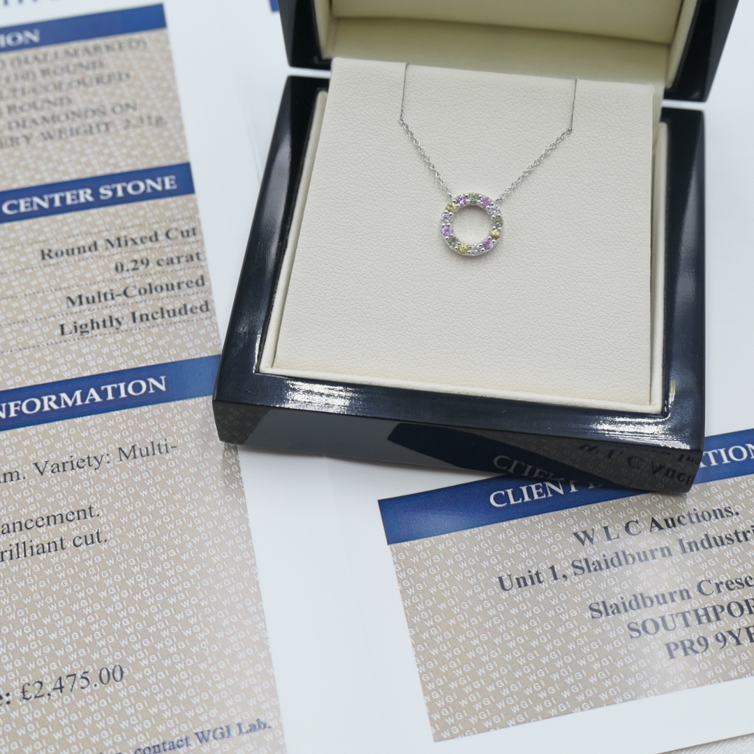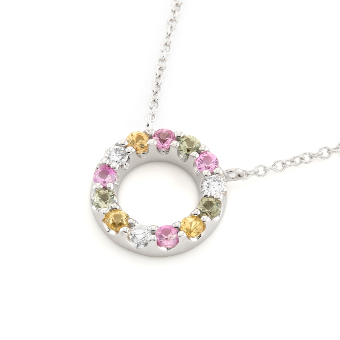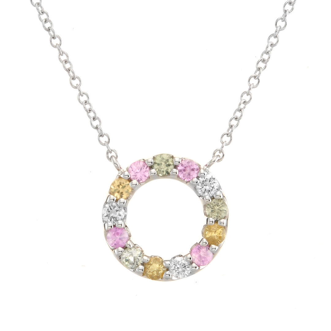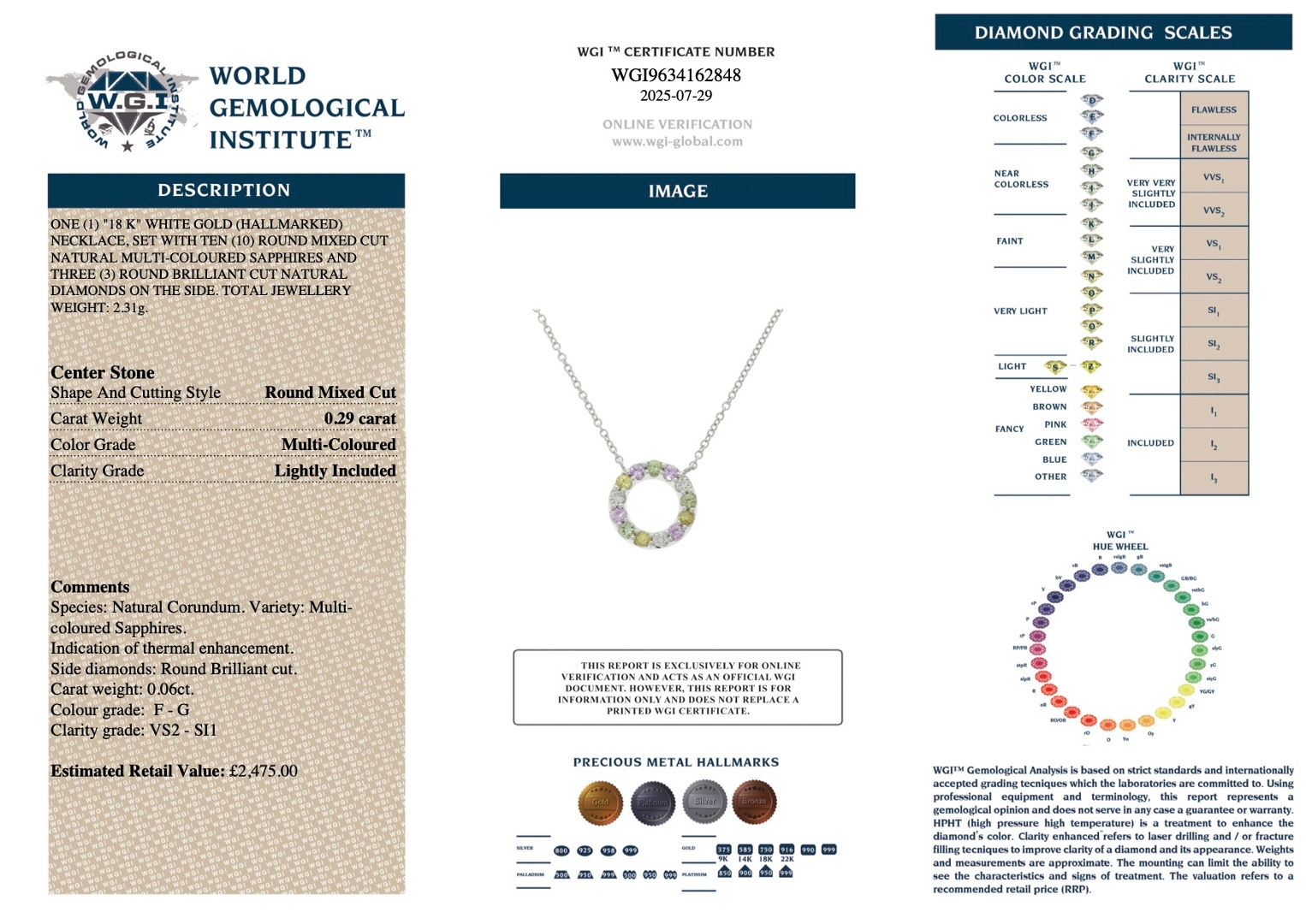 A brand-new, unused, certified natural diamond & multi-sapphire gemstone circle-shaped cluster pendant, set with round mixed-cut multi-sapphire gemstones & brilliant cut diamonds, set in 18ct white gold.