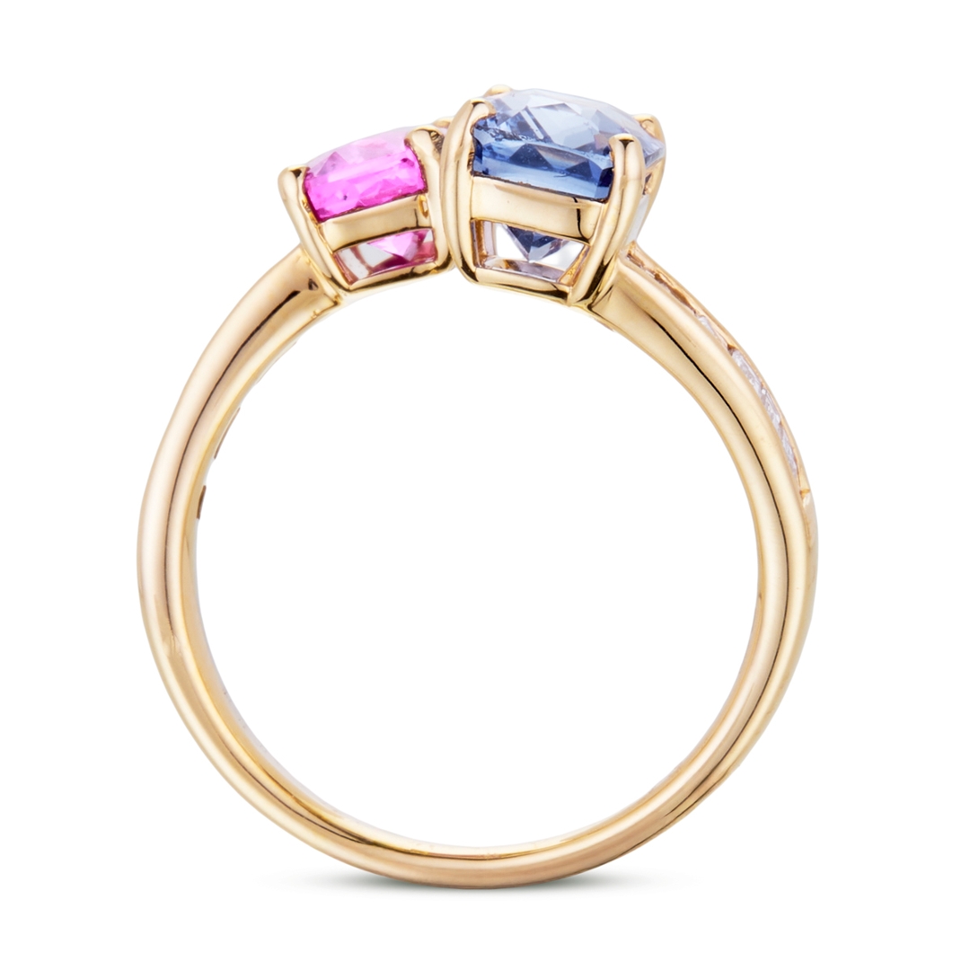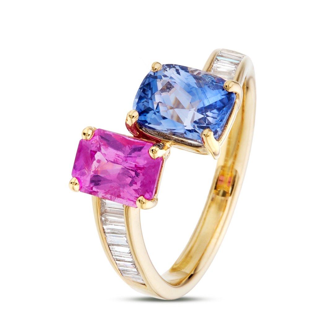 A brand-new, unused, certified natural diamond & multi sapphire emerald-cut toi et moi ring, set with one octagonal mixed-cut pink sapphire & one cushion mixed-cut blue sapphire gemstones at the centre & a cluster of baguette-cut diamonds to the shoulders, set in 18ct yellow gold.