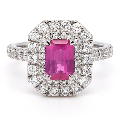 - > Natural Pink Sapphire 0.85ct & Diamond 0.90ct Asscher Shaped Cluster Ring
