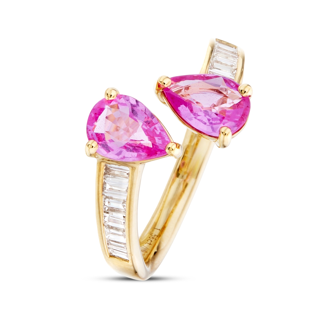 A brand-new, unused, certified natural diamond & pink sapphire pear-cut toi et moi ring, set with two pear mixed-cut pink sapphire gemstones at the centre & a cluster of baguette-cut diamonds to the shoulders, set in 18ct yellow gold.