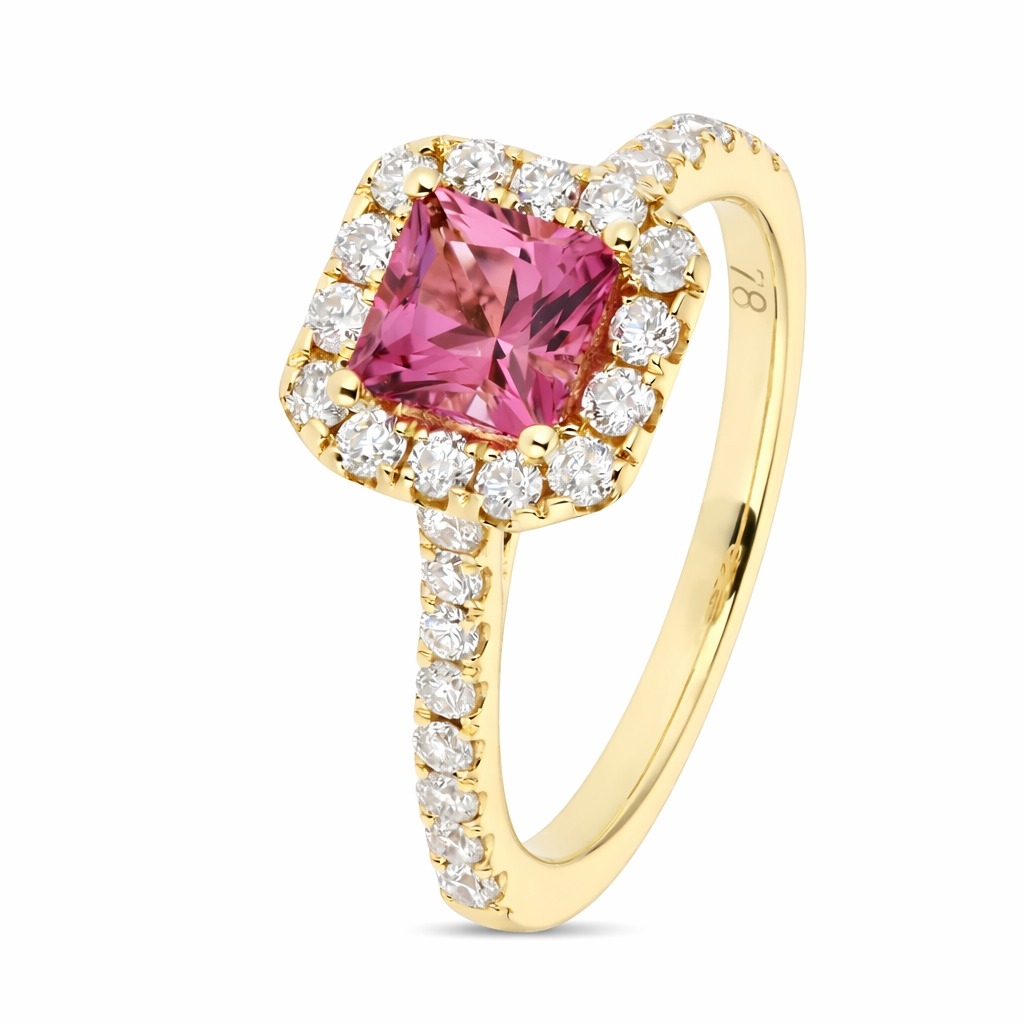 A brand-new, unused, certified natural diamond & pink tourmaline gemstone cushion-shaped cluster ring, set with one square-cut pink tourmaline stone to the centre & a cluster of brilliant-cut diamonds in a halo setting & to the shoulders, set in 18ct yellow gold.