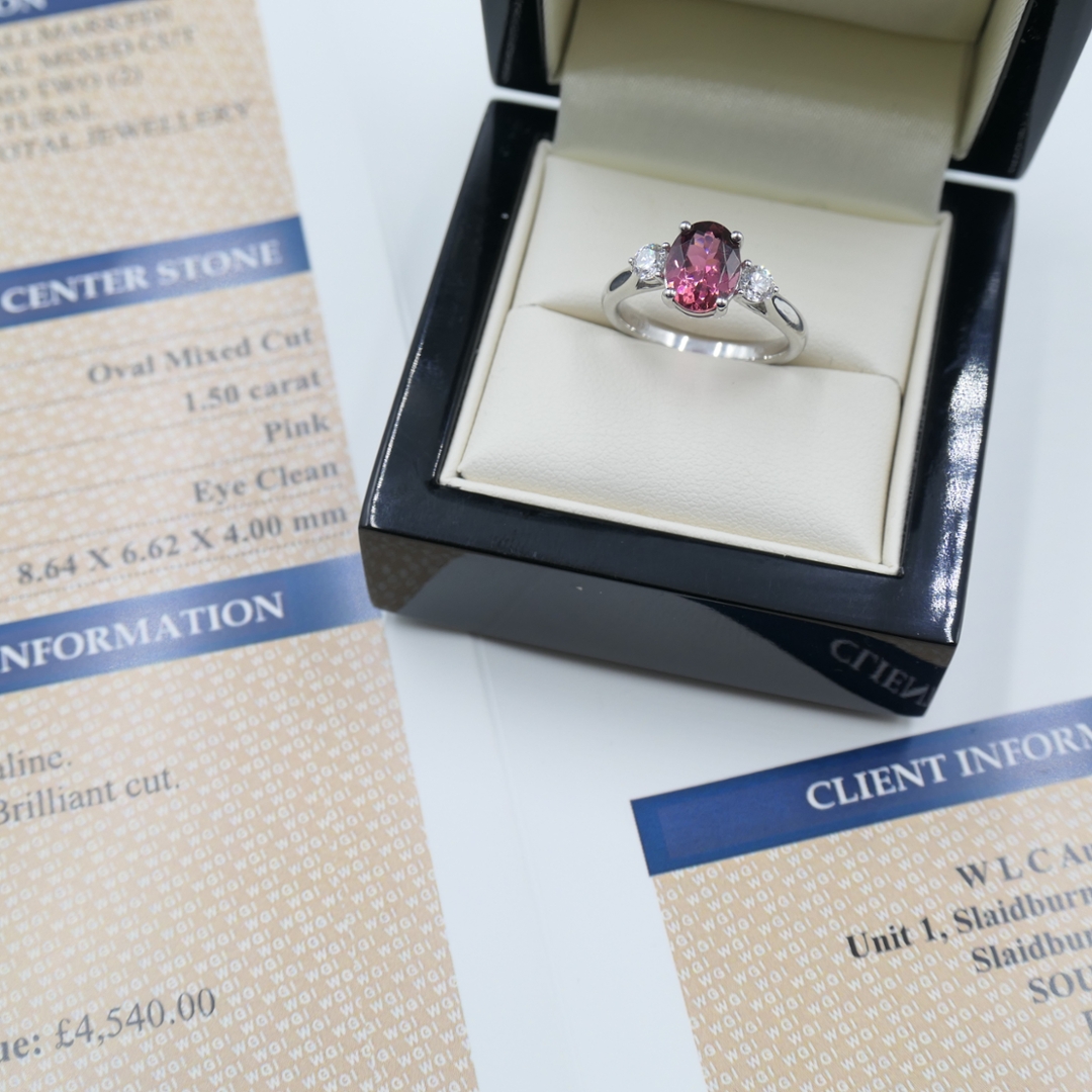 Accompanied by a professional valuation of £4,540, this certified platinum pink tourmaline and diamond ring offers both aesthetic beauty and lasting value. With natural diamonds admired for their enduring investment appeal and the growing desirability of coloured gemstones, this piece represents timeless elegance and exceptional collectable quality.