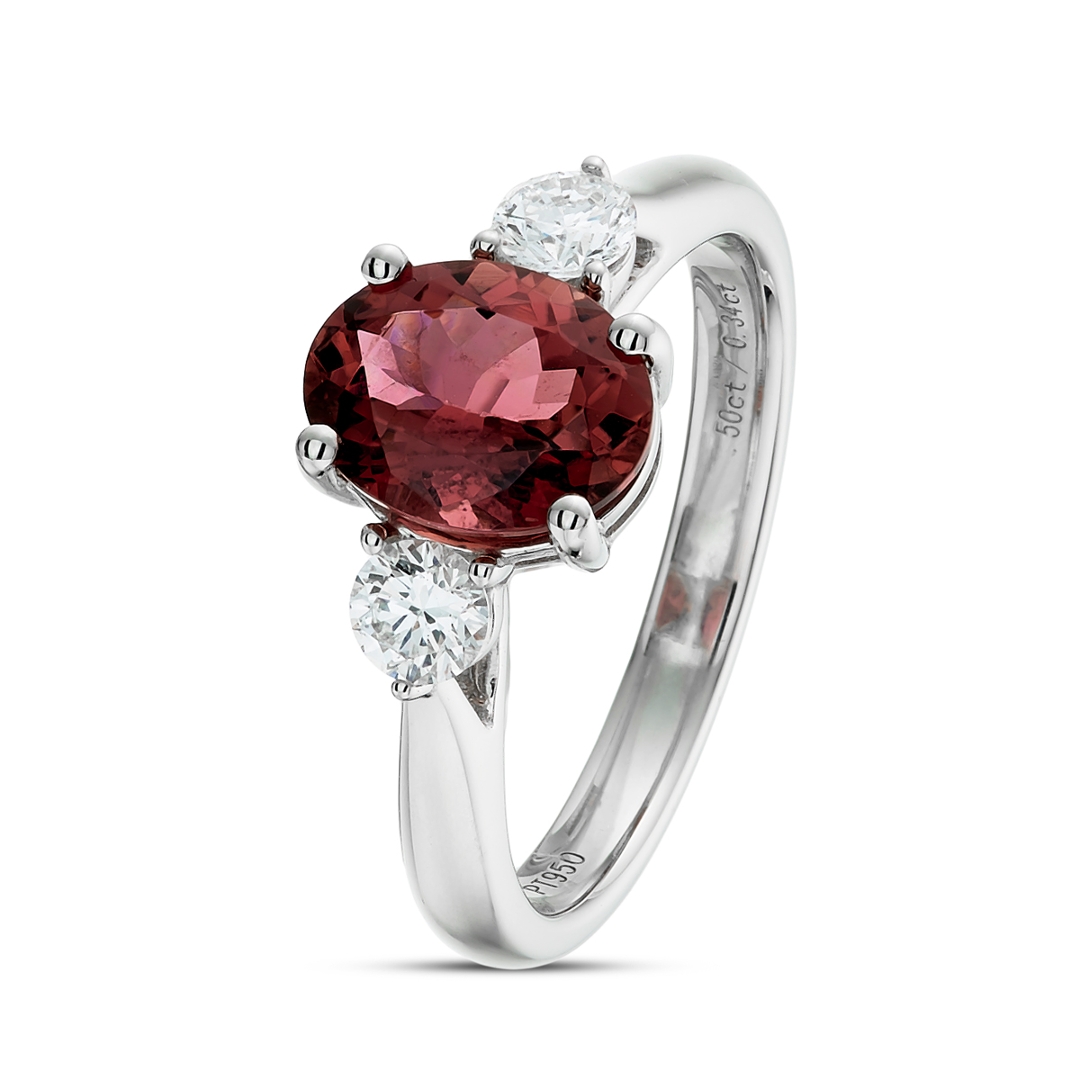 A brand-new, unused, certified natural diamond & pink tourmaline three-stone cluster ring, with one oval mixed-cut pink tourmaline gemstone to the centre & two brilliant-cut diamonds to the sides, set in platinum.