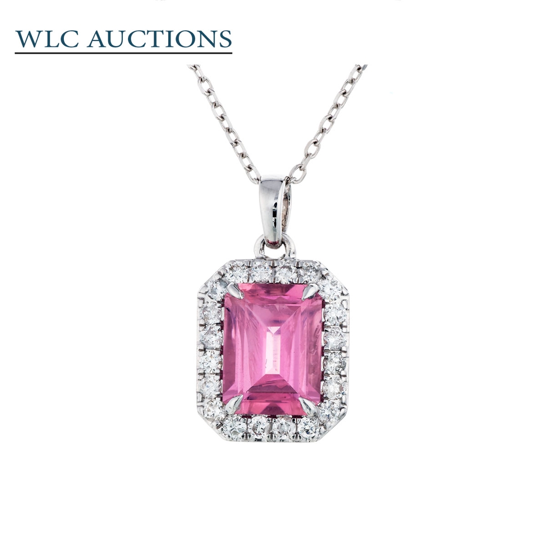 A brand-new, unused, certified natural diamond & pink tourmaline emerald-shaped cluster pendant, with one octagonal step-cut pink tourmaline gemstone at the centre & a cluster of brilliant-cut diamonds in a halo setting, in 18ct white gold.