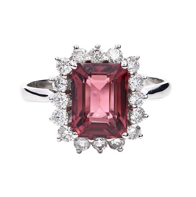 A brand-new, unused, certified natural diamond & pink tourmaline gemstone cluster ring, set with one emerald-cut pink tourmaline gemstone at the centre & a cluster of brilliant-cut diamonds in a halo setting, set in 18ct white gold.