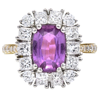 A brand-new, unused certified ring, this exquisite creation combines the enduring strength of platinum with the richness of 18ct yellow gold. At its centre rests a 1.66ct cushion mixed-cut purple sapphire, radiating a vivid and elegant hue that makes it truly distinctive. Surrounding the sapphire is a lavish halo of both princess-cut and brilliant-cut diamonds, totalling 1.30ct, which extend seamlessly onto the shoulders. Graded H in colour with SI clarity, these natural diamonds bring remarkable brightness and fire, enhancing the beauty of the sapphire while ensuring the design exudes sophistication from every angle.