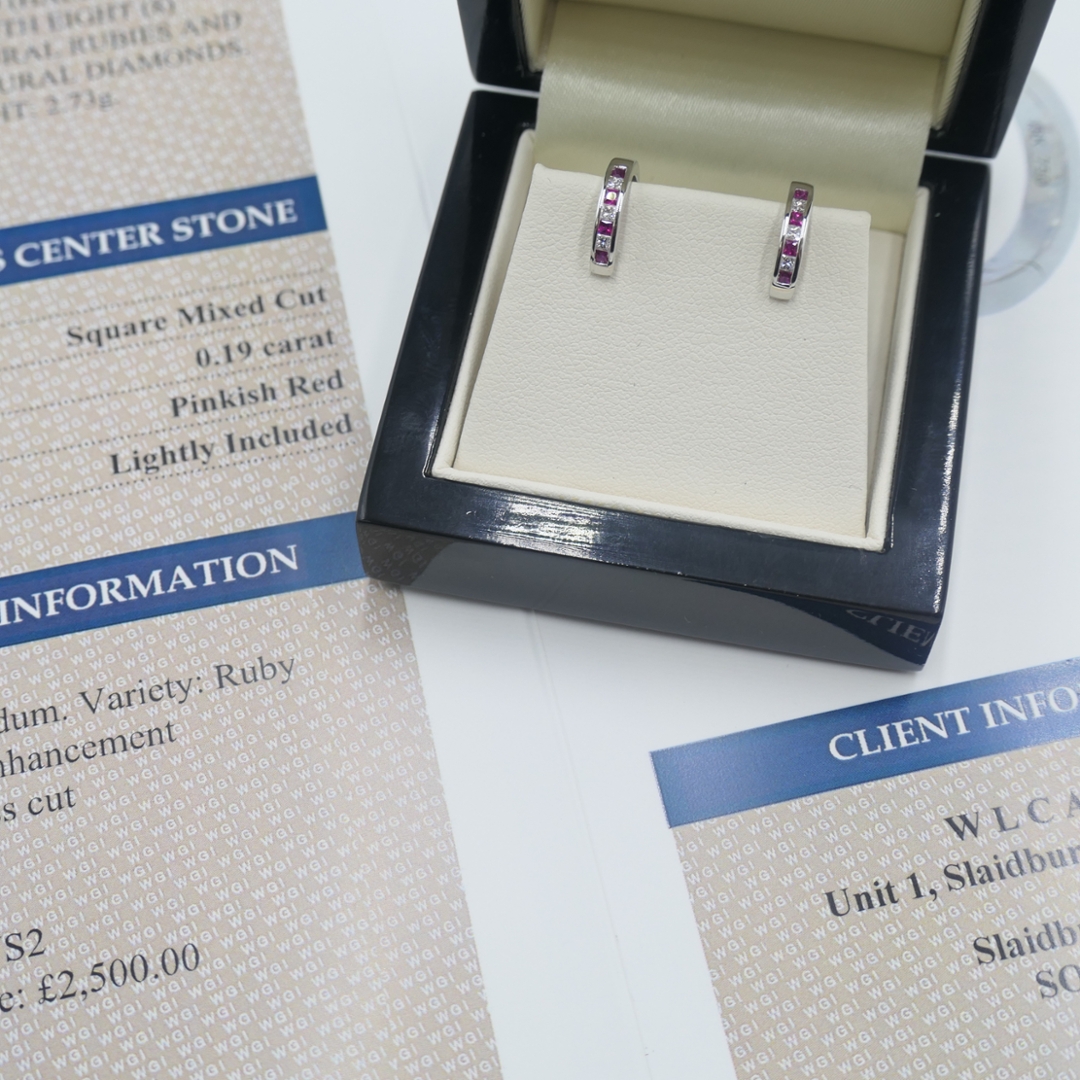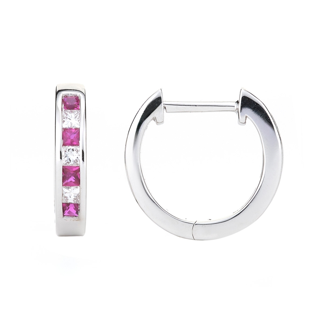 A brand-new, unused, certified pair of natural diamond and ruby gemstone hooped earrings, this stunning set radiates sophistication and timeless allure. Expertly crafted in luxurious 18ct white gold, the earrings feature a captivating arrangement of eight square mixed-cut ruby gemstones, totalling 0.19 carats, their pinkish-red tones exuding warmth and elegance. Between each ruby lies a princess-cut natural diamond, totalling 0.14 carats, graded F–G in colour and VS1–VS2 in clarity. The contrast between the vibrant rubies and the crisp brilliance of the diamonds creates a mesmerising interplay of light and colour, a true testament to the beauty and craftsmanship of fine jewellery.