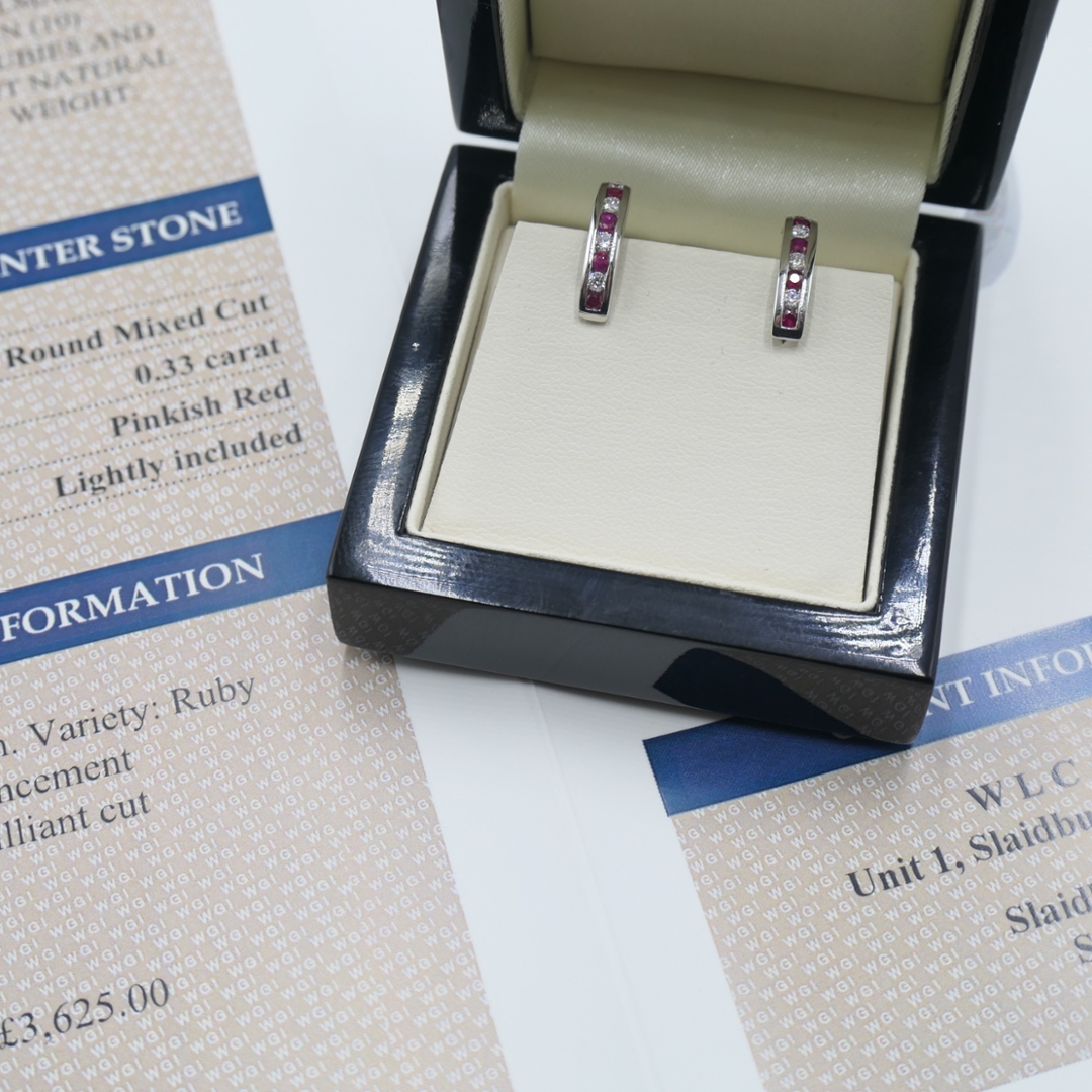 A brand-new, unused, certified pair of 18ct white gold natural diamond and ruby hooped earrings, this stunning set exudes elegance, colour, and timeless sophistication. Each earring is adorned with ten round mixed-cut rubies, totalling 0.33ct, showcasing a vivid pinkish-red hue that symbolises love, passion, and strength. Accentuating their brilliance are eight brilliant-cut natural diamonds, totalling 0.21ct, graded VS2 to SI1 in clarity and E to F in colour, offering exceptional fire and near-colourless sparkle.