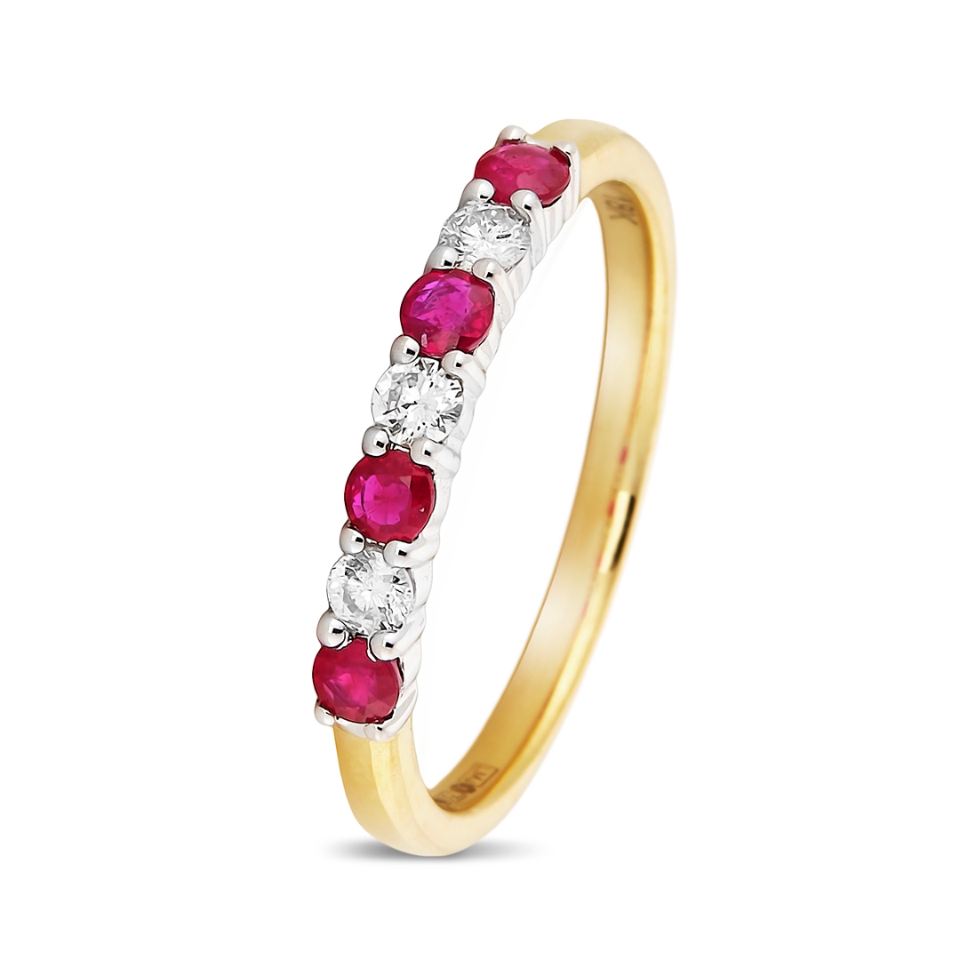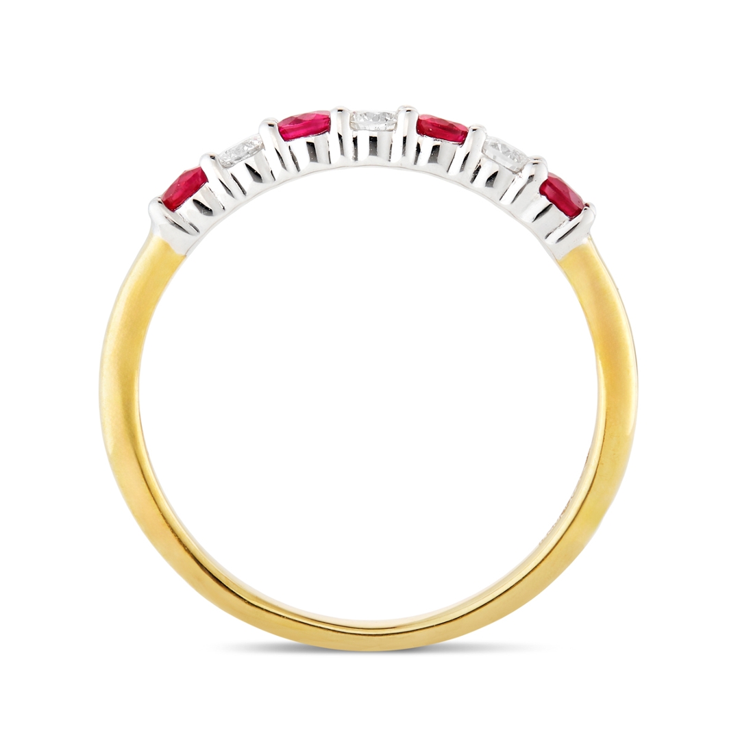 A brand-new, unused, certified natural diamond & ruby gemstone eternity ring, set with four round mixed-cut ruby gemstones & three brilliant-cut diamonds, set in 18ct yellow & white gold.