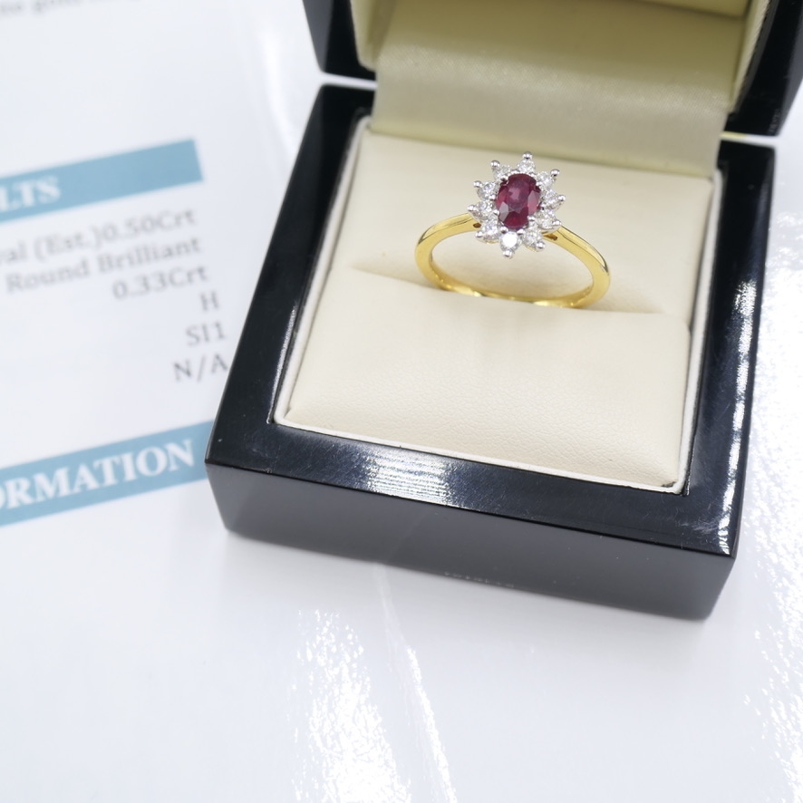 A brand-new, unused, certified natural diamond & ruby gemstone cluster ring, set with one oval-cut ruby stone to the centre & a cluster of brilliant-cut diamonds in a halo setting, set in 18ct yellow & white gold.