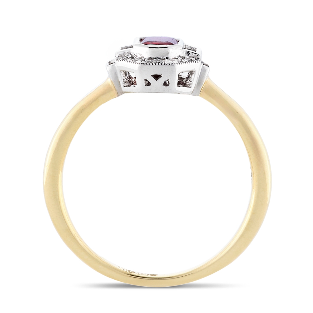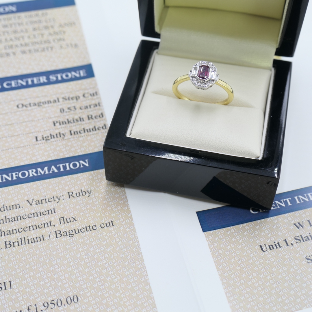 A brand-new, unused, certified 18ct yellow and white gold natural diamond and ruby cluster ring, this exquisite piece is a perfect harmony of bold colour, refined detail, and timeless craftsmanship. At the heart of the design lies a stunning 0.53ct octagonal step-cut ruby, radiating a rich pinkish-red hue that symbolises passion, vitality, and enduring love. Its clean, angular cut enhances the gemstone’s depth and brilliance, offering a bold focal point that immediately draws the eye. Encircling the ruby is a meticulously arranged halo of brilliant-cut and baguette-cut natural diamonds, totalling 0.12ct.