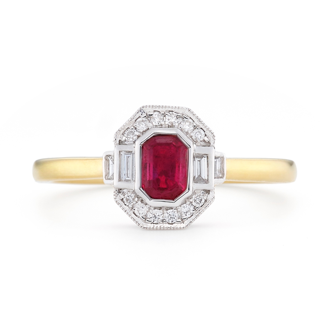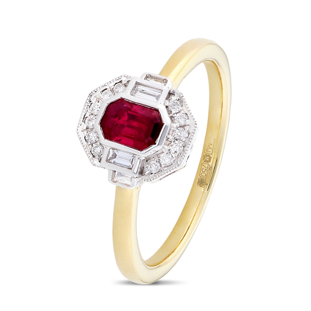 A brand new, unused, certified natural diamond & ruby gemstone cluster ring, set with one octagonal step-cut ruby gemstone at the centre & a cluster of brilliant-cut & baguette-cut diamonds in a halo setting, set in 18ct yellow & white gold.
