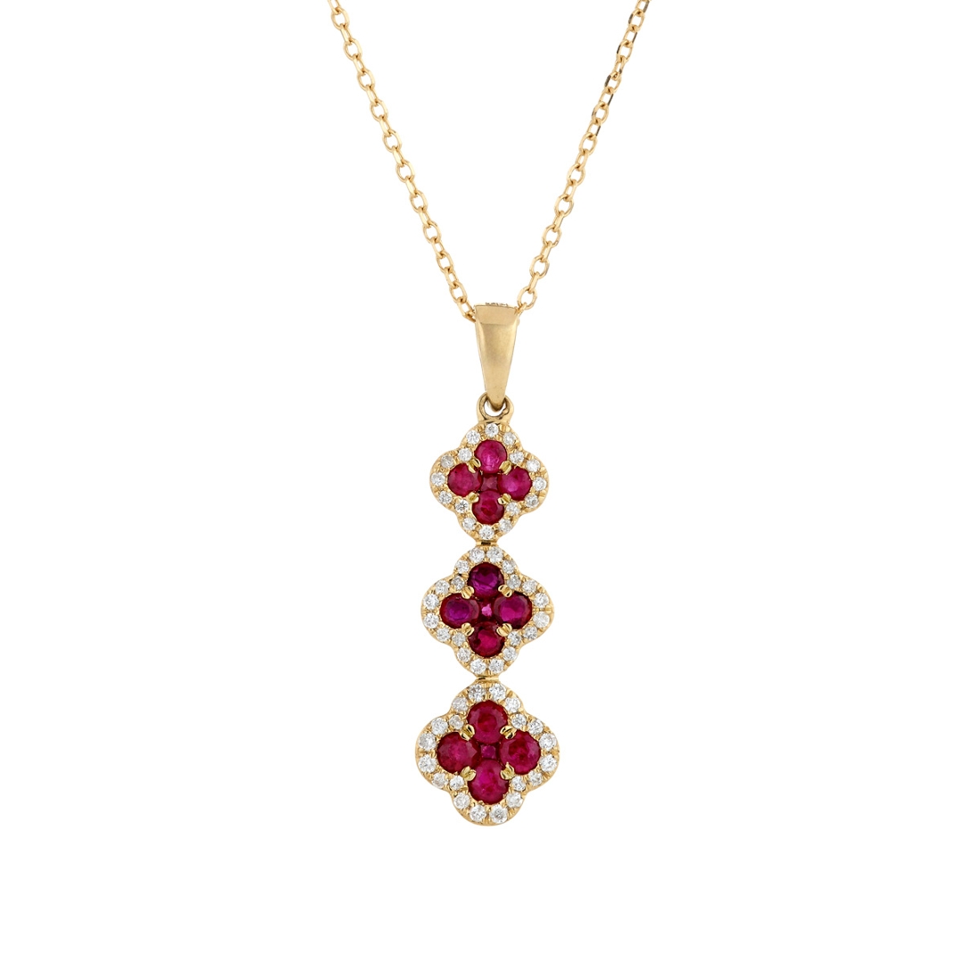 - > Natural Ruby 0.54ct & Diamond 0.14ct Clover Shaped Droplet Cluster Pendant