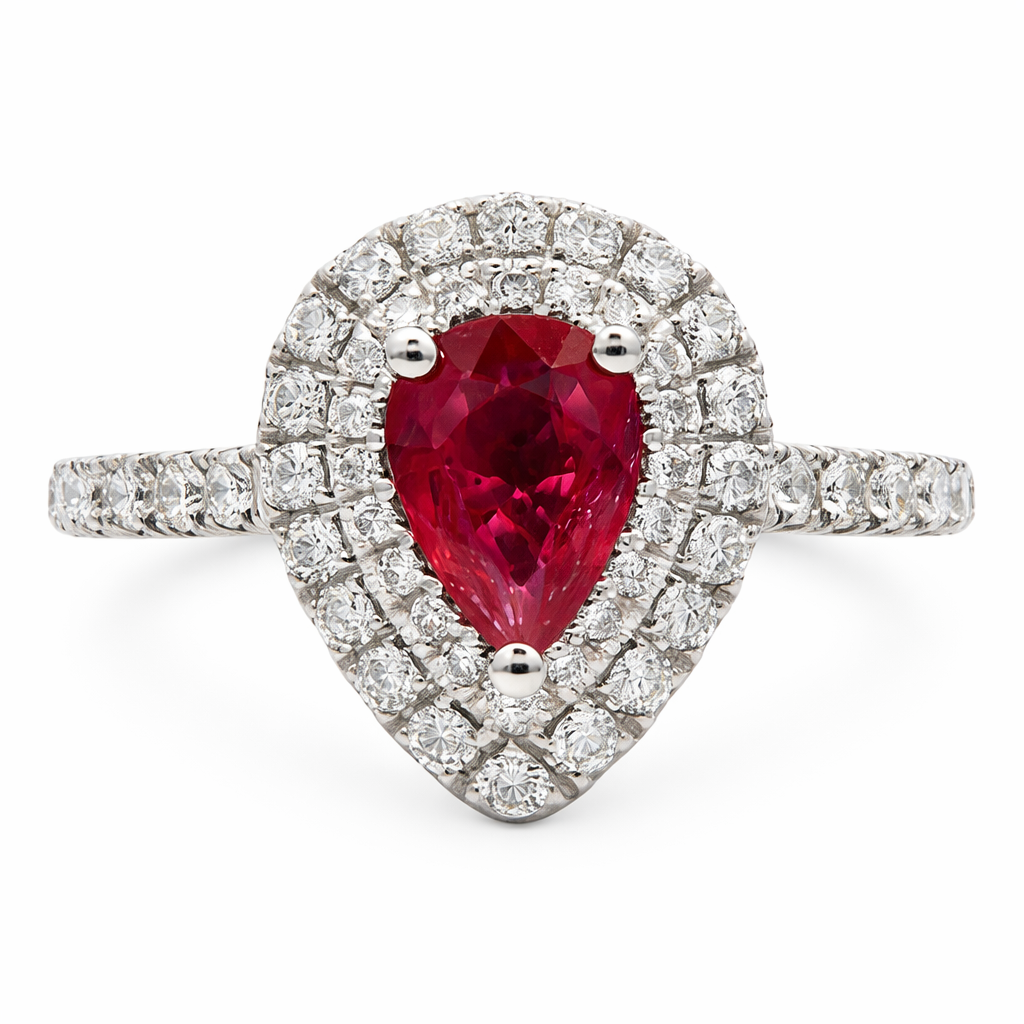 A brand-new, unused, certified natural diamond & ruby pear-shaped cluster ring, with one pear-cut ruby gemstone at the centre & a cluster of brilliant-cut diamonds in a double halo setting & to the shoulders, set in platinum.