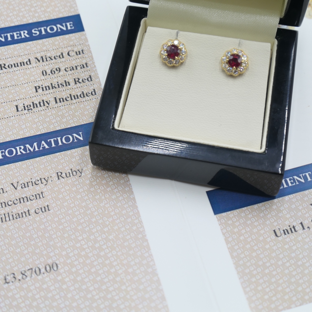 A brand-new, unused certified pair of natural diamond and ruby gemstone flower-shaped cluster rings that radiate sophistication and timeless allure. Each ring is set with a captivating round mixed-cut ruby at its centre, totalling 0.69 carats and displaying a beautiful pinkish-red hue that symbolises passion and vitality. Surrounding each ruby is a halo of brilliant-cut natural diamonds, totalling 0.36 carats, graded E–F in colour and VS2–SI1 in clarity. These diamonds exude exceptional sparkle and purity, reflecting the unmatched beauty and authenticity that only natural stones can provide. Their fire and brilliance perfectly enhance the rubies' richness, creating a design that feels both classic and contemporary.