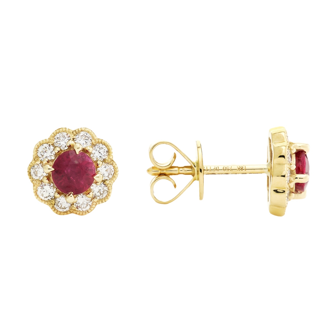 A brand-new, unused, certified pair of natural diamond & ruby gemstone flower-shaped cluster rings, set with two round mixed-cut ruby gemstones to the centre & a cluster of brilliant-cut diamonds in a halo setting, set in 18ct yellow gold.