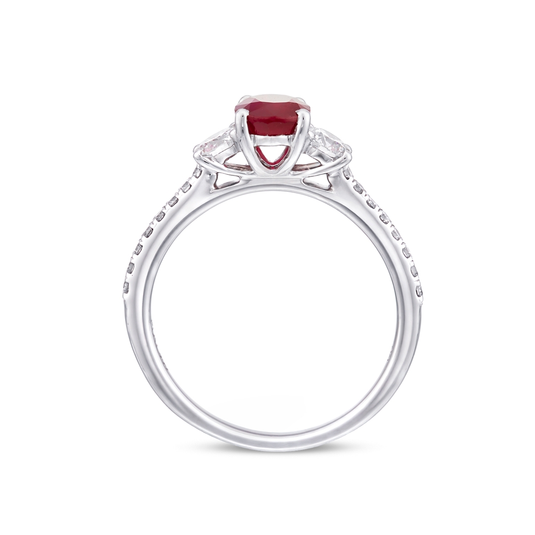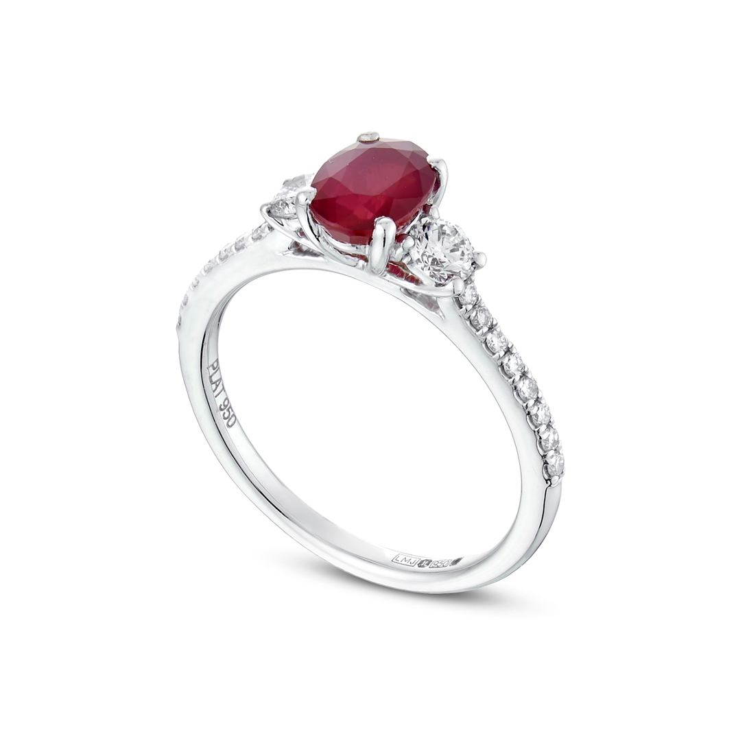 A brand-new, unused certified natural diamond and ruby three-stone cluster ring, crafted in platinum and designed to showcase a bold yet refined composition of colour and brilliance. At the centre sits an oval mixed-cut ruby weighing approximately 1.09 ct, displaying a rich purplish-red tone with excellent depth and presence. Flanked by two brilliant-cut natural diamonds and complemented by additional diamonds set along the shoulders, the design creates a layered and balanced profile that enhances both the central gemstone and the overall sparkle.