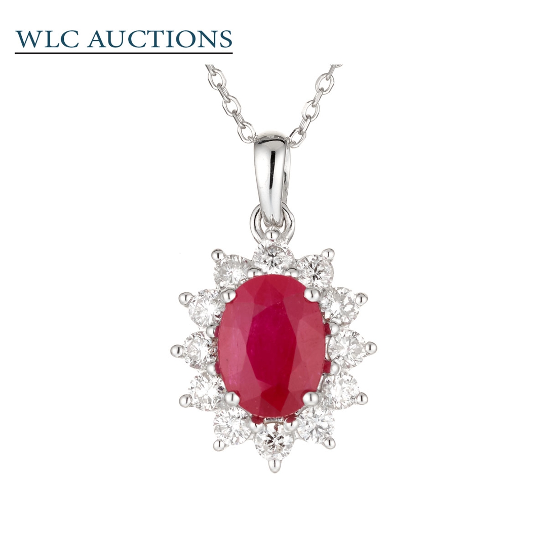 A brand-new, unused, certified natural diamond & ruby cluster pendant, with one oval mixed-cut ruby gemstone at the centre & twelve brilliant-cut diamonds in a halo setting, in 18ct white gold.